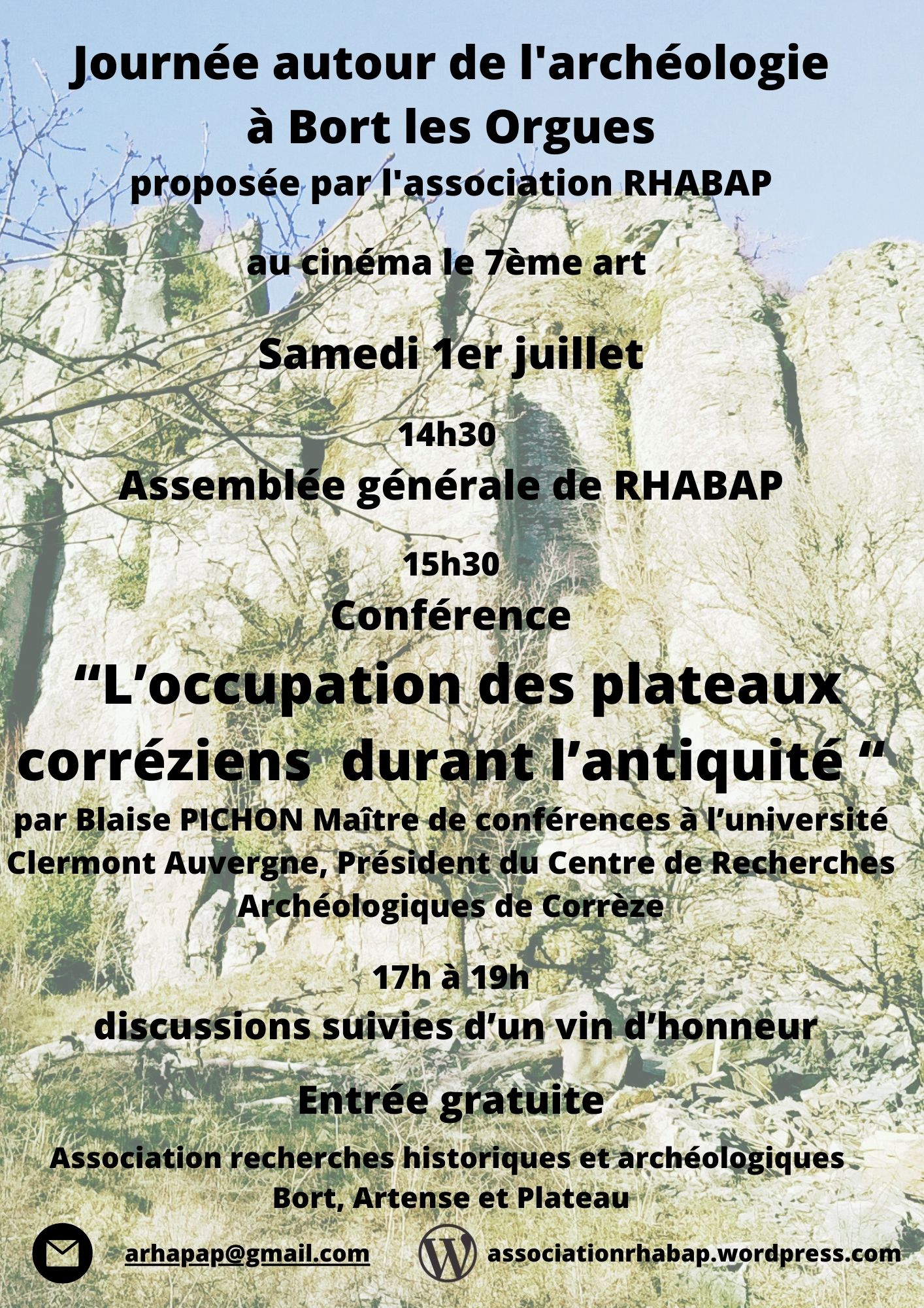 La journée commence à 14 h 30 au cinéma de Bort les Orgues par l’assemblée générale de l’association, la présentation commence à partir de 15 h 30 et ce terminera par un vin d’honneur qui durera de 17h à 19h.